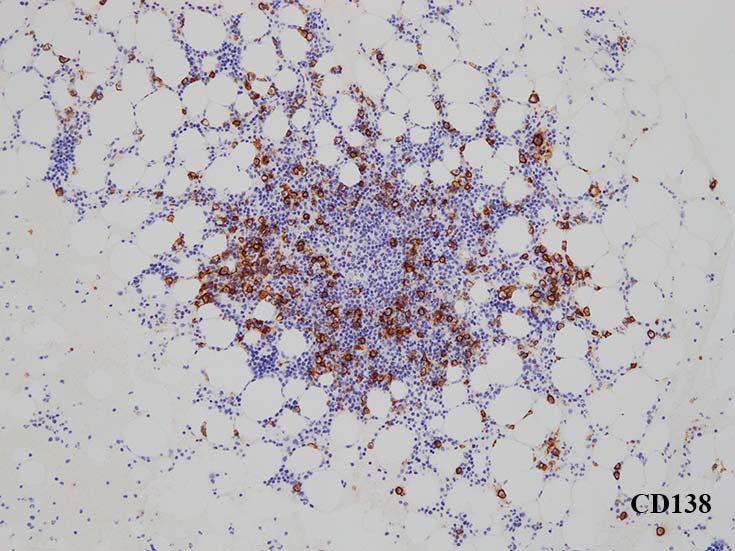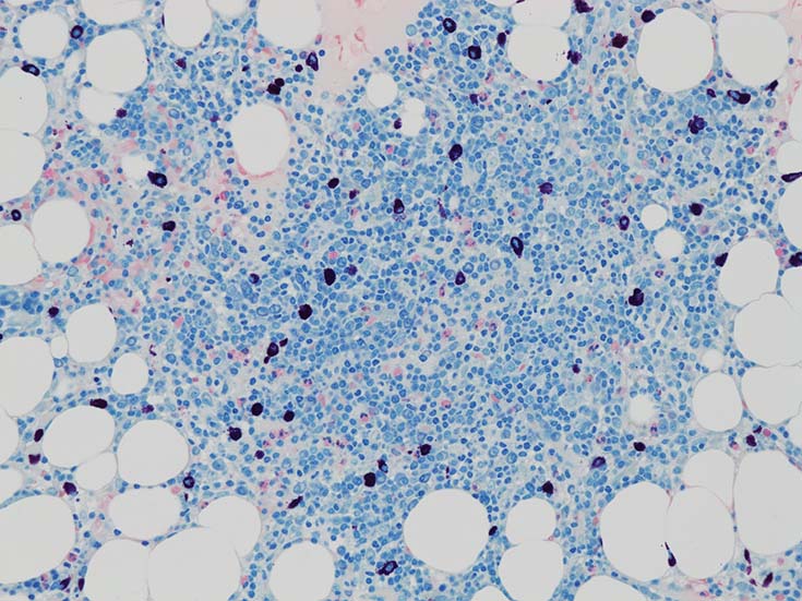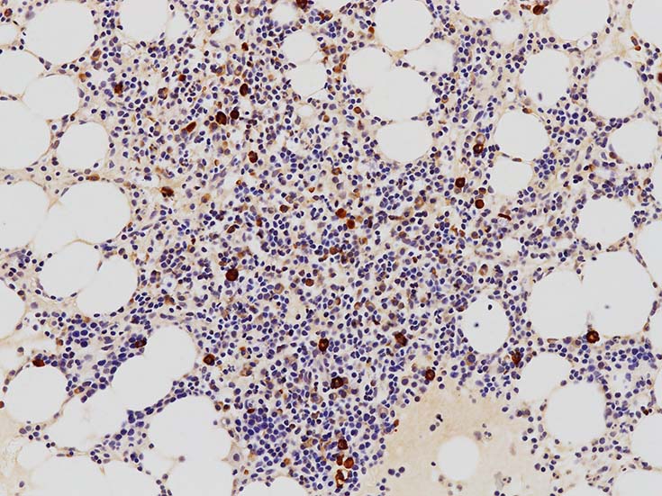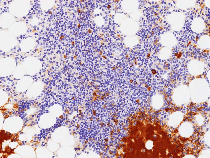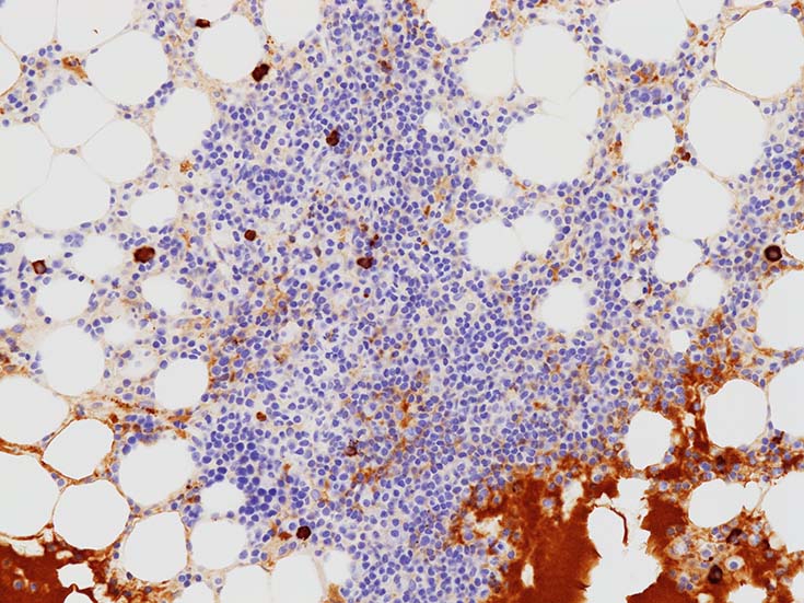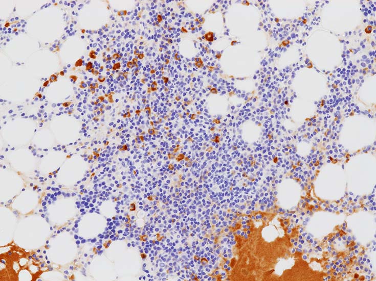 通常/ 正常の骨髄クロットでは 背景タンパク液のIgMはそまらないかごく淡い陽性. しっかり陽性を示す本例では血中IgMの増加を示唆する. IgMに染まる形質細胞が増加している.