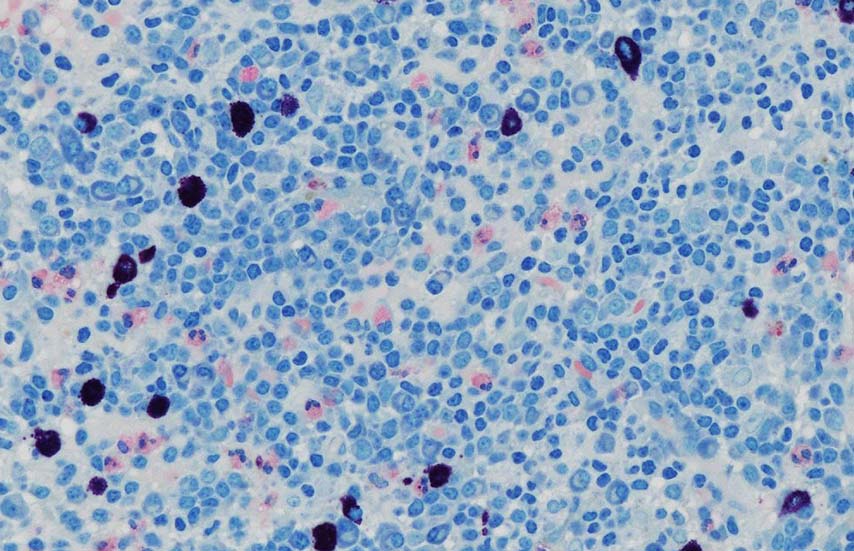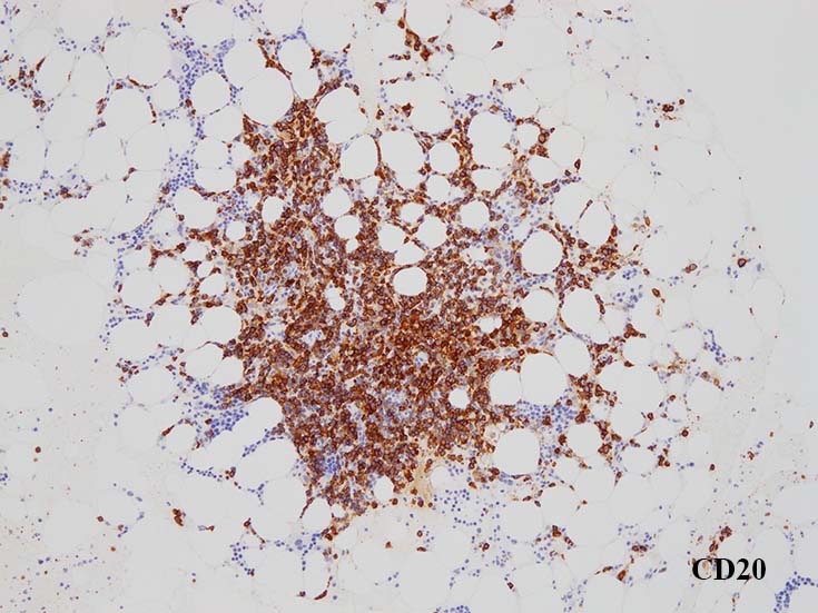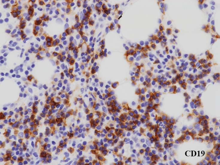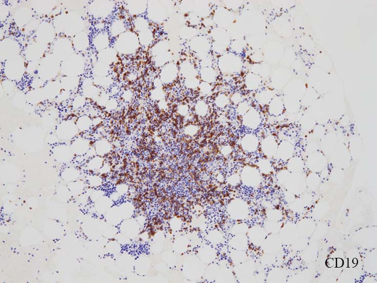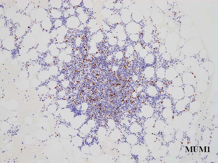 増殖するB細胞はCD19+, CD20+. 結節内に増加する形質細胞はCD19+, CD20‐である. (多発性骨髄腫の形質細胞様細胞はCD19陰性).~ 多くのB細胞がMUM1陽性を示す. CD5, CD10, BCL6は陰性.