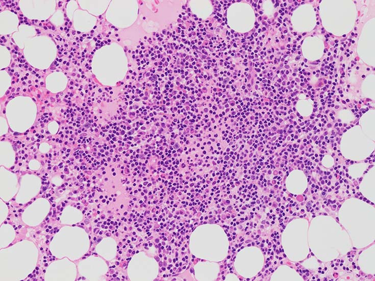小型B細胞リンパ球, 形質細胞様リンパ球(plasmacytoid lymphocyte), 形質細胞の混在する腫瘍性増殖で骨髄, リンパ節, 脾臓病変を認める.