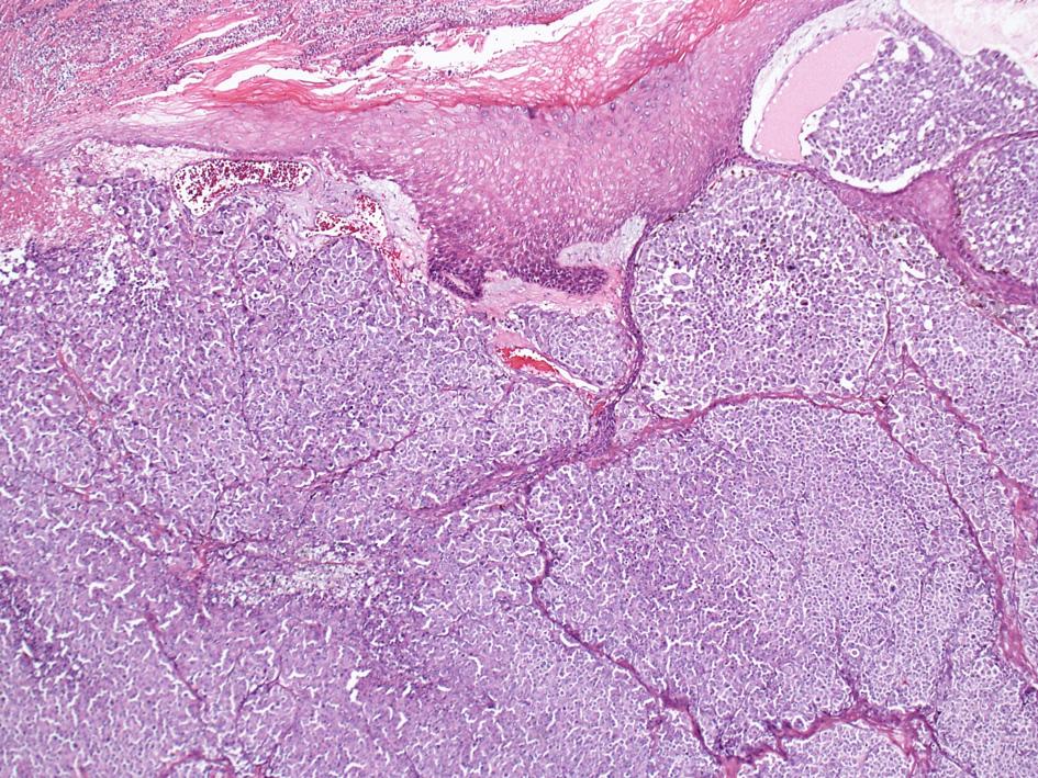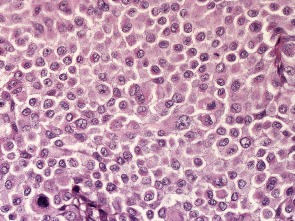 - 真皮内病巣は通常好酸性から淡明豊かな細胞質をもつ卵円形ないし円形の類上皮細胞から構成されている。細胞異型度と核分裂像は症例によりさまざま。