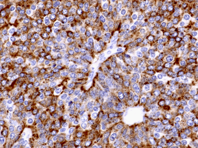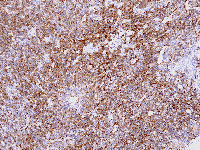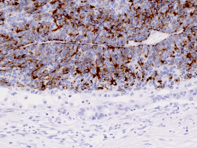 CAM5.2, CK(AE1/3), CK8およびCK18は通常陽性となる。一方, CK7, CK19, CK20は陰性が普通。EMAは半数に陽性。