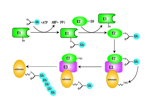 ユビキチンは活性化酵素(E1), 結合/転移酵素(E2), 連結酵素/リガーゼ(E3)の3種類の酵素が連続的に作用することにより, 標的タンパク質に共有結合することがわかっている。