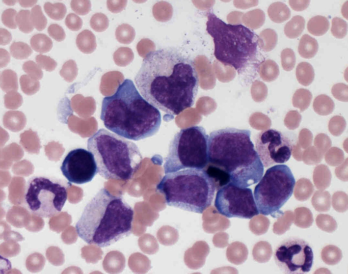 異型細胞が集簇, 散在性に増殖している。N/C比大. 粗なクロマチンをもち核小体を複数もつ核に紫の色調の細胞質をもった大型細胞である。類円形の核の他, くびれや捻じれを示す核, 多型な核も出現しているように見える(May-Giemasa染色)。HEでも大型細胞の集族がある. smearの異型細胞は濃い青色調の細胞質にアズール顆粒が認められる。核クロマチンは凝集しているように見える。