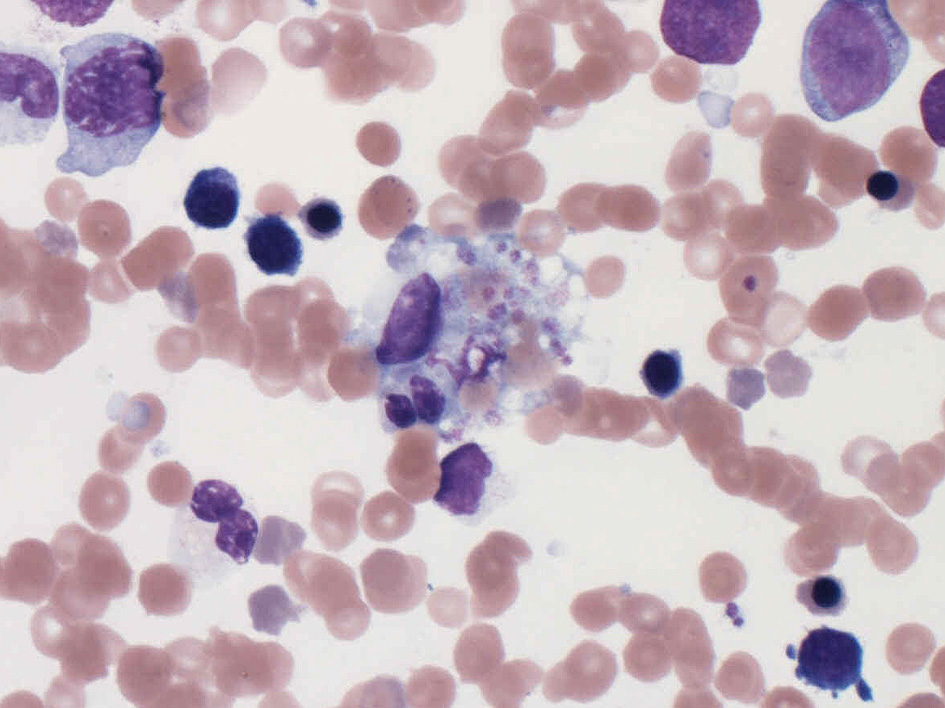 左端の1)HE標本ではclotの辺縁部に貪食マクロファージの集簇が認められる。2), 3)はスメアの貪食像。hemophagocytic syndrome(HPS)が考えられる所見。末梢血には顆粒リンパ球が4%認められた。