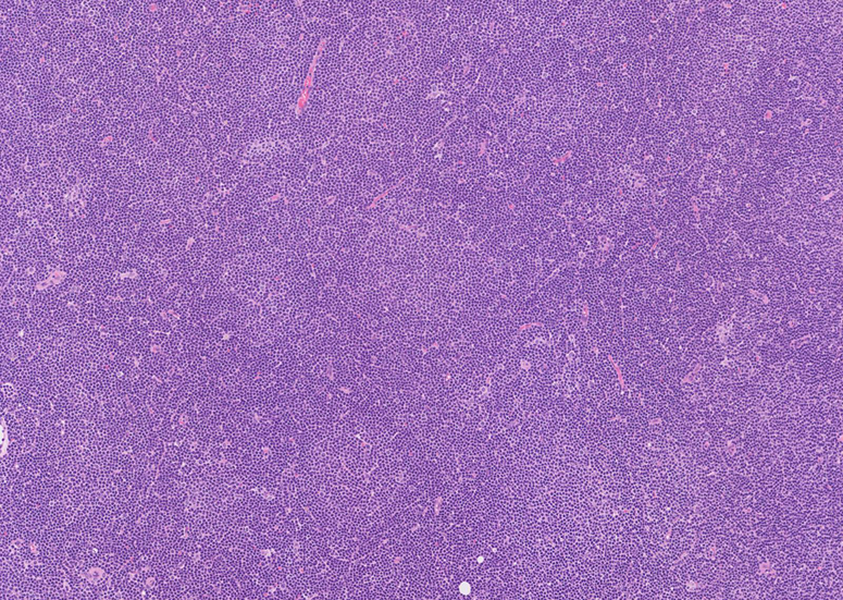 リンパ節全体の病変で, 境界不明瞭なvague nodularな病変を認める. 密なsmall lymphocytes部分は青色調にみえ, immunoblastsやprolymphocytesの混在する部位は明るい結節様に見える.