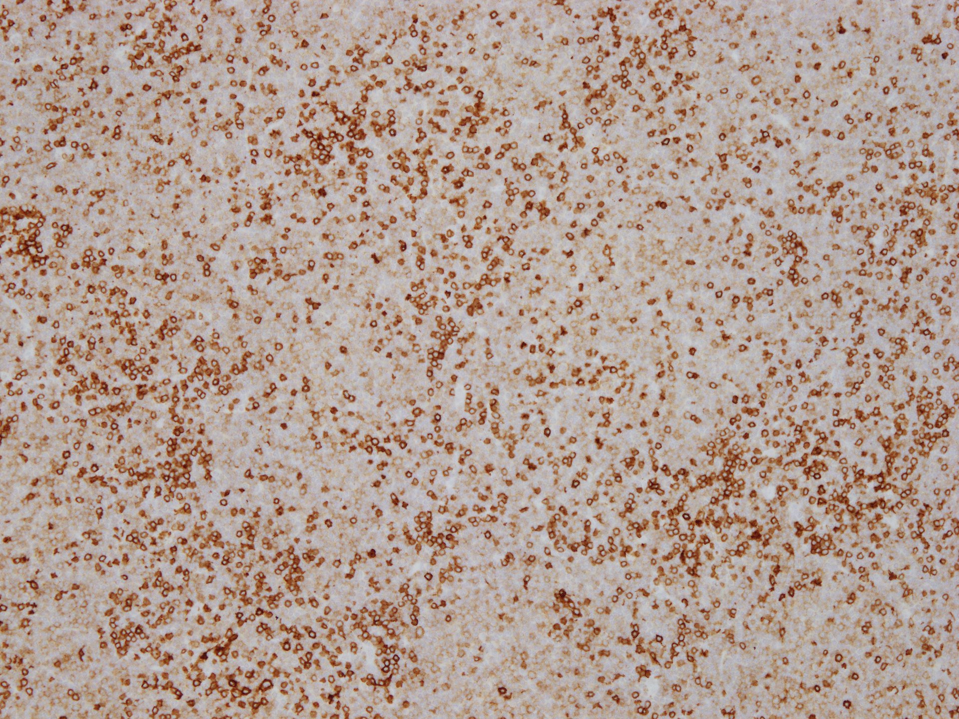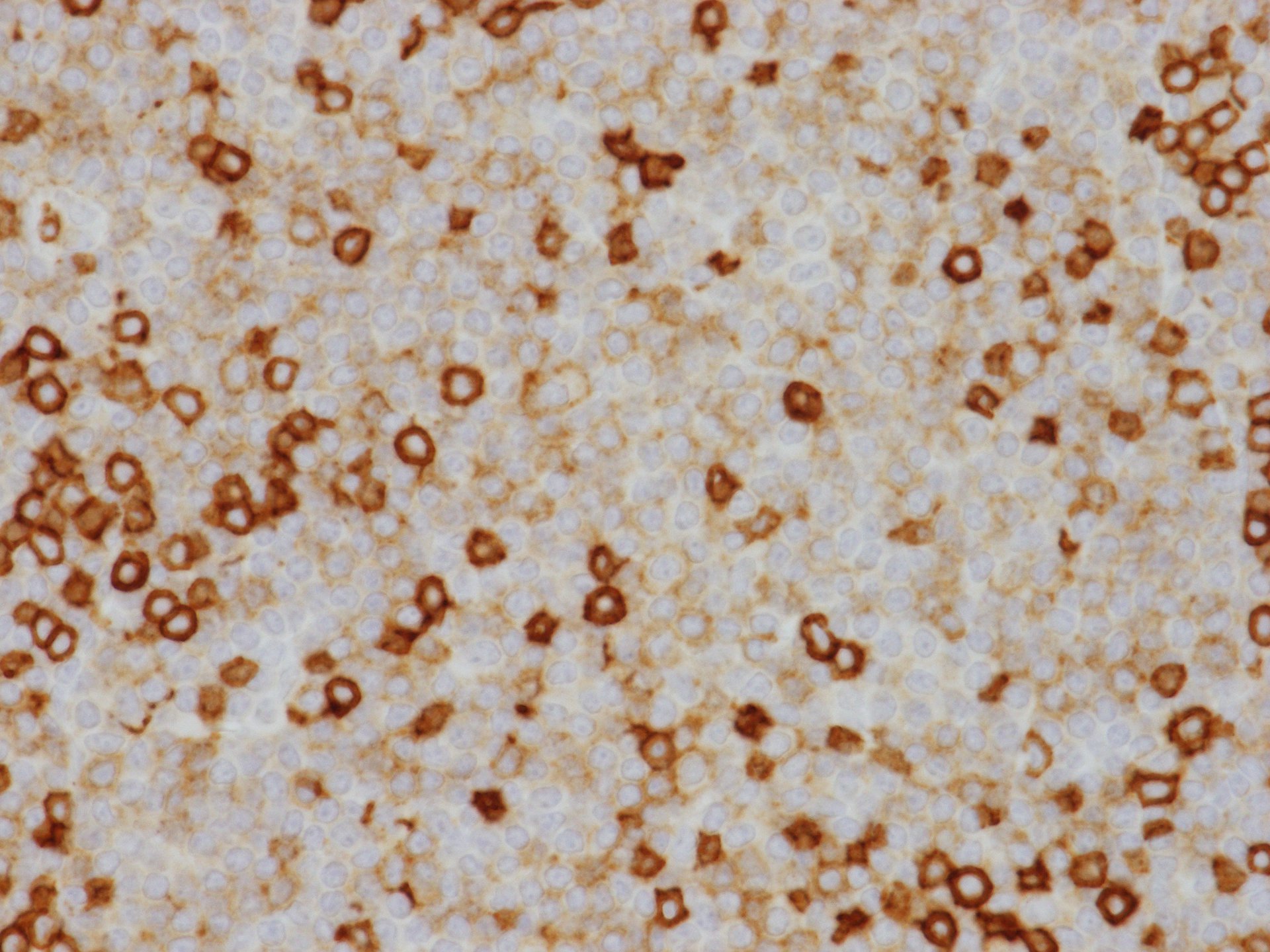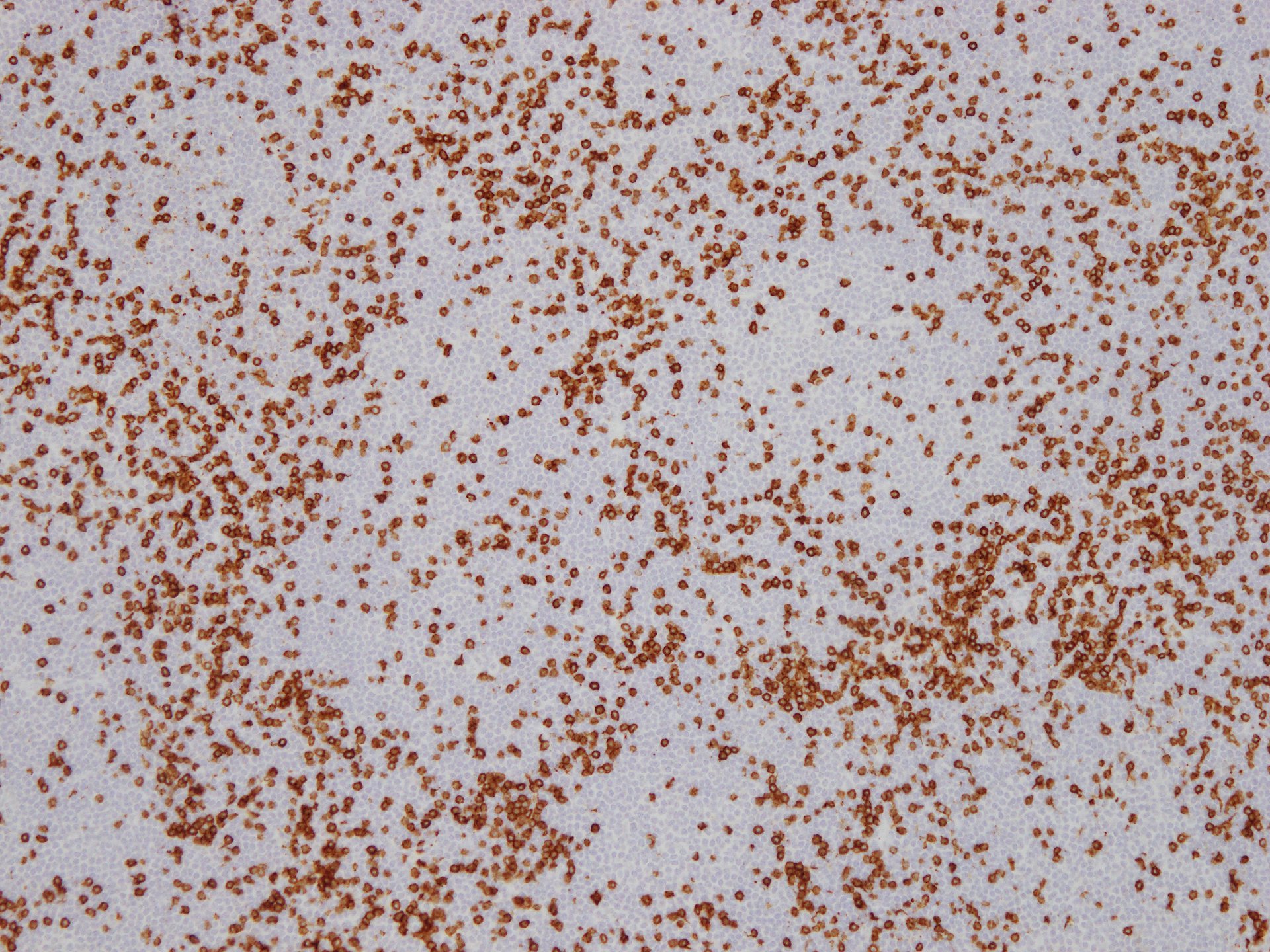 CD20が広く陽性. CD3陽性T-cellsも多く混在する. CD5は腫瘤状に増殖するB-cellにはT-cellよりもかなり弱く染色されていることに注意.