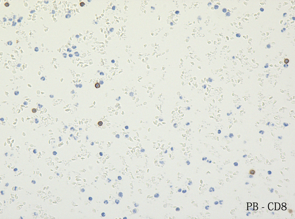 末梢血内にEBER陽性細胞がin situ hybridizationにより確認できる。右はCD8陽性細胞。