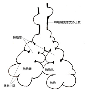 終末細気管支は, 通常2回2本の呼吸細気管支に分枝する。呼吸細気管支は数本の肺胞管に移行し, ここに2-5個の肺胞嚢が開口する。