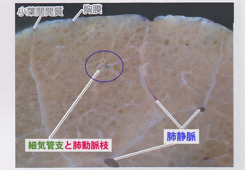 肺小葉は弾性結合組織に囲まれ各々1本の細動脈, 細静脈, リンパ管, 1本の終末気管支からの分枝が存在する。小葉間結合織内を肺静脈, 気管支動静脈, リンパ管が走っている。