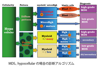 骨髄が低形成の場合, 細胞の存在パターンが大切となる。diffuseかpatchyかを判定することからアルゴリズムが始まる。