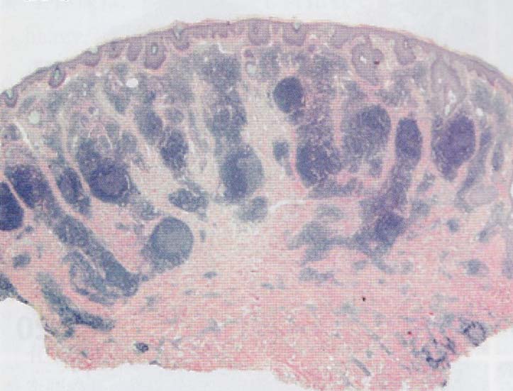 左:pseudolymphoma. top heavy; 病変主座が真皮上層にあり, 病変が対称性.