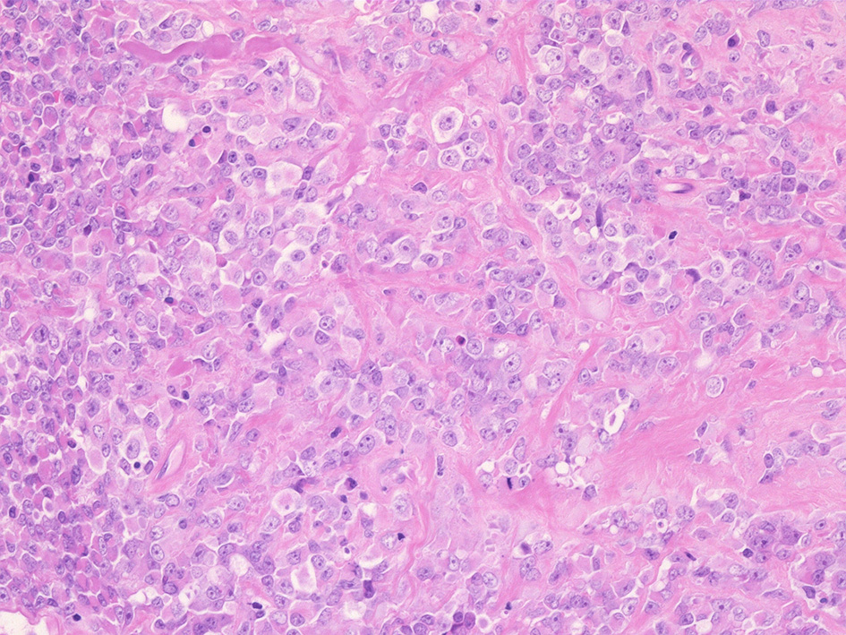 ② 少量の線維性組織を間質に類円形/多稜形のvesicularな核と好酸性, 淡明な細胞質をもつ類上皮様の中~大型の細胞が集簇, 増殖している.mitosisが多い. 辺縁にはrhabdoid cellsのchohesiveな増殖が認められる.