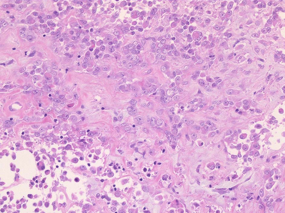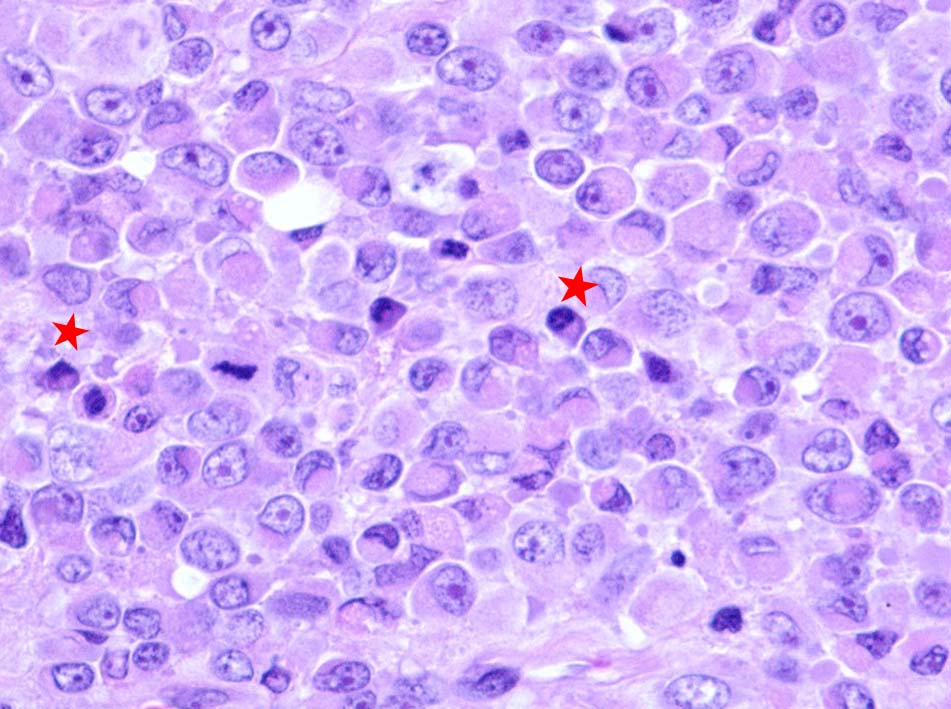 球状の封入体様にみえる構造が出現し, 核偏在や核を圧排し, 三日月/半月状の核がみられている. mitosisが散在. 形質細胞が少数混在して認められる.