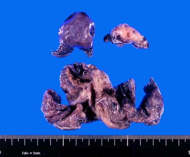 胸腔鏡下ブラ切除術5ヵ月後, 縦隔腫瘤で再発. 他院で腫瘍切除+右肺上葉切除を施行. 肉眼的には腫瘍は完全に切除できた.