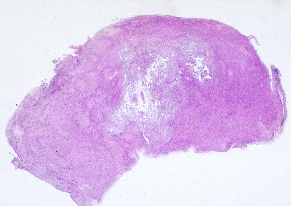 ③ 間質の線維組織が多く, 硝子化やmyxomatous changeが認められる. 二核の大型巨細胞が散在している. 細胞は比較的一様なサイズ形態で, 多型は高度ではない印象.