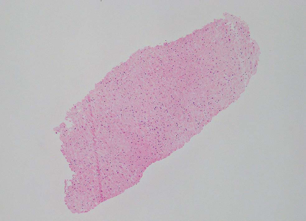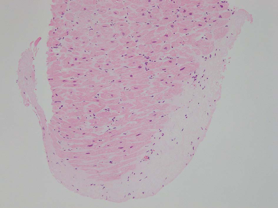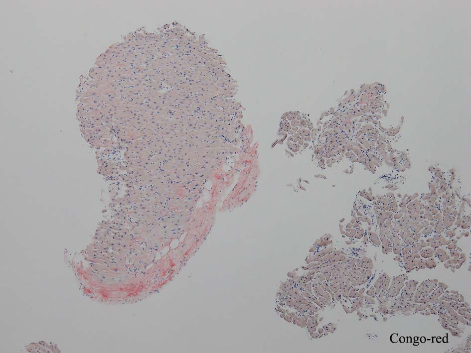 4年後の2月 精査目的に当科紹介、精査の結果、心アミロイドーシスが疑われ、確定診断目的で心筋生検が施行される。