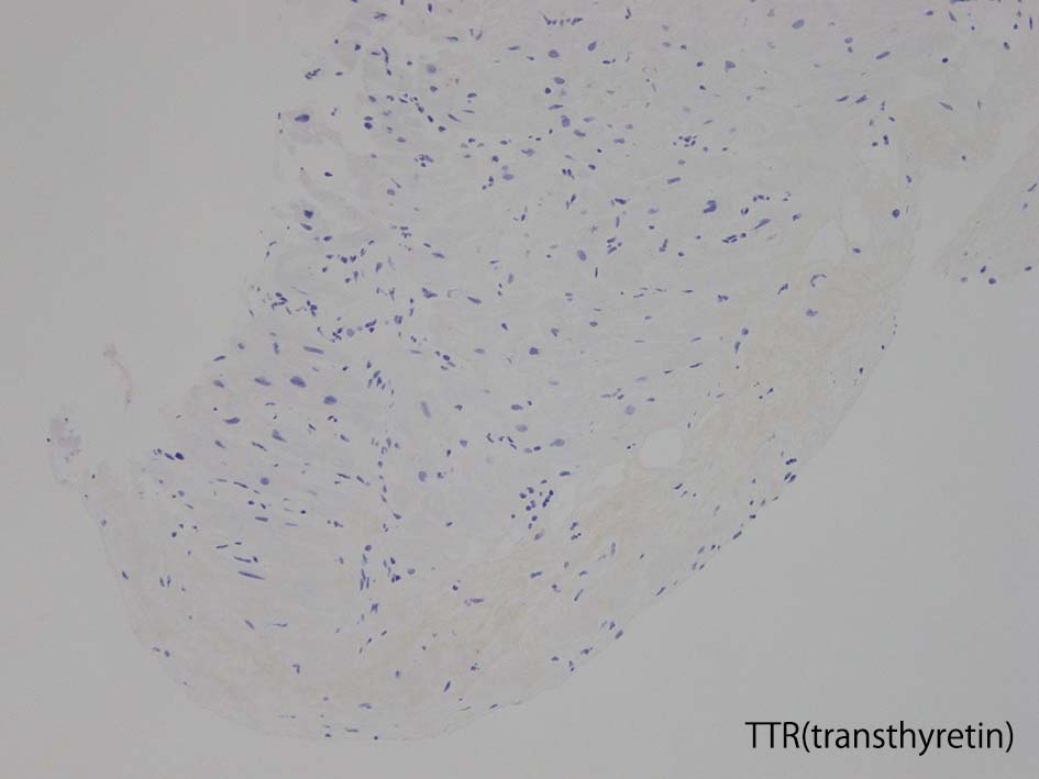 κまたはλ陽性染色はALアミロイドーシスを、トランスサイレチン陽性染色は遺伝性または野生型トランスサイレチン(ATTRmtまたはATTRwt)アミロイドーシスを、血清アミロイドA成分陽性染色は二次性(AA)アミロイドーシスを示す。