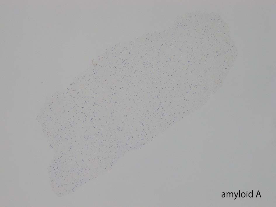 アミロイドの免疫組織化学的染色(例えば、κおよびλ軽鎖、トランスサイレチン、血清アミロイドA成分)により、アミロイドーシスのタイプを決定することができる *4。