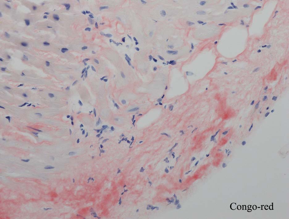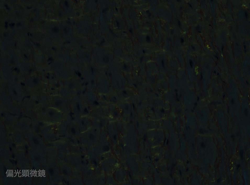 HE所見では, 明瞭な沈着物はわかりにくい. 血管壁が確認できる血管も少ない. congo-red染色で沈着が考えられる所見があり, 簡易偏光で(みずらいけれど)apple-greenの偏光があるように見える.(サムネイルのクリックで大きな画像が見られます)