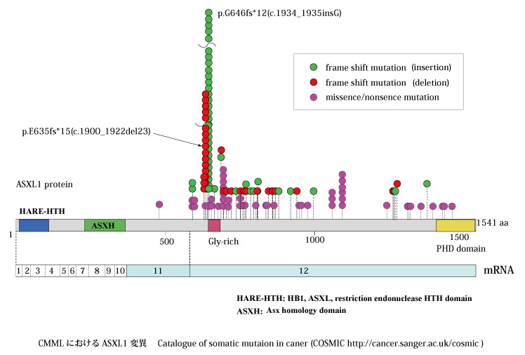 ○CMMLにおけるASXL1のmutationは, exon12に集中している。flame shift変異の頻度が高い。