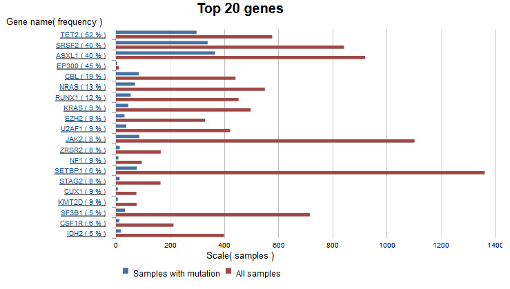 Catalogue of somatic mutation of cancer (COSMIC)*11によるCMML 変異遺伝子top20(右図)