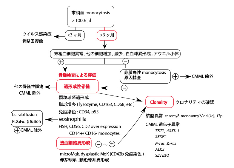 1 持続する末梢血のmonocytosis >1000/mm3(μl);単球が末梢 白血球の10%以上を占める 2 フィラデルフィア染色体または BCR-ABL1 fusion geneは陰性。 3 PDGFRA, PDGFRB, or FGFR1 再構成なし(特にeosinophiliaを伴う症例では必要) 4 末梢血あるいは骨髄の芽球 <20% 芽球は myeloblasts, monoblasts, promonocytes を含む。 5 1つ以上の骨髄球系細胞に異形成が認められる。