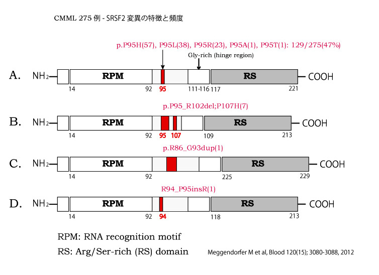 ○ それぞれの変異はMPD/MDSの異なる病型において認められる. SRSF2変異はCMMLとaCMLに, SF3B1はRARS-tに高頻度に出現する。U2AF1変異はMDS/MPNの経過中に認められる二次性白血病に頻度が高い.