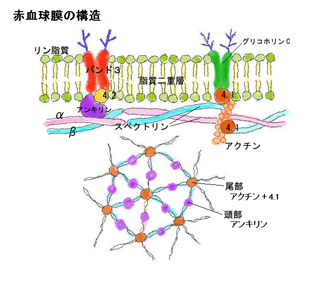 赤血球膜はスペクトリンspectrinと呼ばれる線維蛋白のフィラメントが六角形の網目状構造を形成し立体的に円盤形の網目かごをつくり, その外側に脂質の皮膜をかぶせて内容の高濃度ヘモグロビンがもれないようにしている。