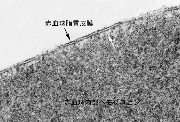脂質二重膜直下の白矢印で示した低電子密度の薄い層はスペクトリン線維などから形成されている赤血球膜骨格の部分