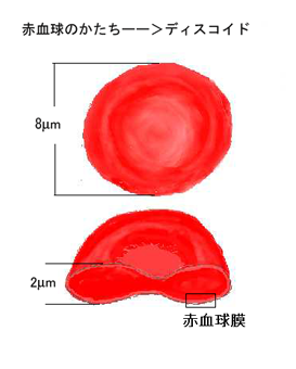 直径約8μmで両面中央のくぼんだ円盤形をしています。この形は球形のような自然な形ではなく, 形態を保つために赤血球はエネルギーを必要とします。