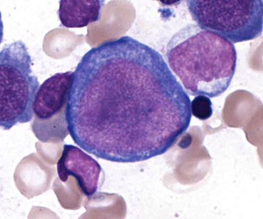 - 直径20μmほど.赤芽球系細胞では最大. 類円形の核を細胞中心にもつ.クロマチンは繊細顆粒状でアズキ色の点描のように見える.核には青みの強い核小体を2-3個もつ.