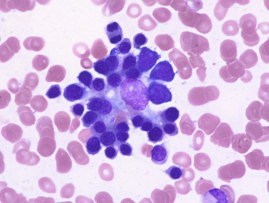 - 細胞質はpolysome(RNAに富むribosomeが数個ずつ集まり集塊を作る)が多く全面紺青色を呈する. ただし前駆細胞より分化したばかりではpolysomeを増やす段階でまだ細胞質の青色調は濃くなっていないことに注意.