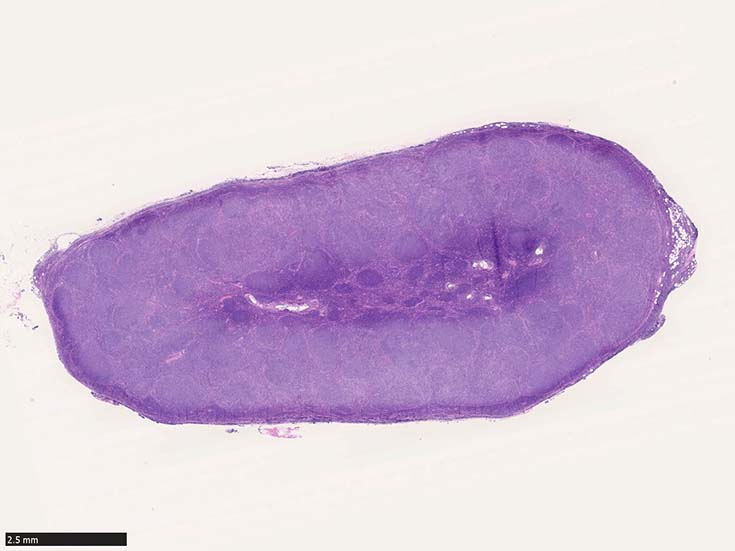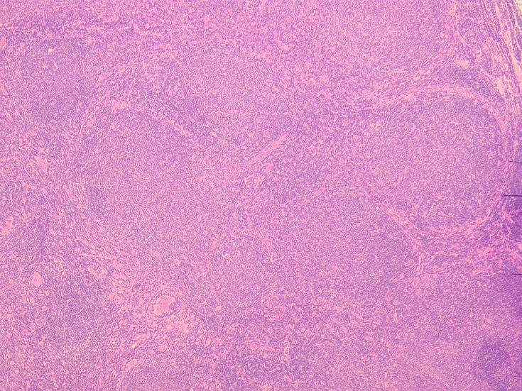 腫瘍性濾胞は均等にリンパ節全体に分布する。辺縁洞は閉塞され,時に被膜外へ浸潤する。