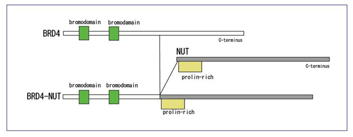 NMCの特徴は非常にシンプルな核型異常[t(15;19)]にある。しばしば t(15;19)(q14;p13.1)が単独な異常のことがある。このパターンは癌よりもfusion geneが発生に重要な役割をはたしている 白血病に類似している。