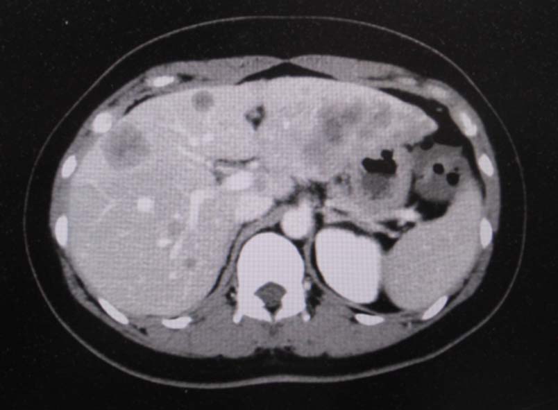 CT画像:左肺から縦隔に及ぶ腫瘍(肺は単独病変. 肺内転移なし.),乳腺腫瘤,子宮腫瘤, 多発肝腫瘤あり.