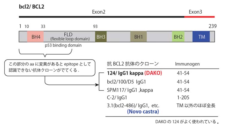 抗体によっては変異したタンパク質をepitopeとしてとらえられず陰性となるBCL2 pseudo-negativeがありえる。(図 )*4
