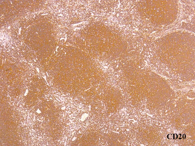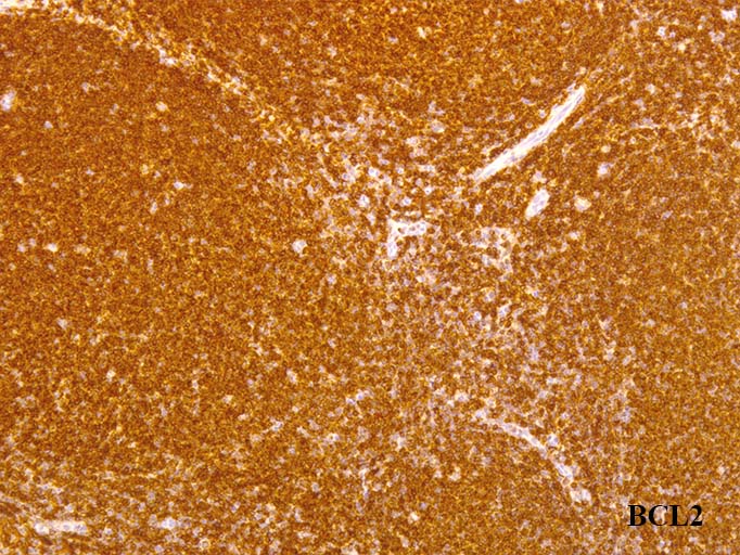 bcl-2陽性. CD10, bcl-6は陰性. bcl-2陽性の一次濾胞をFLと間違えないよう注意.