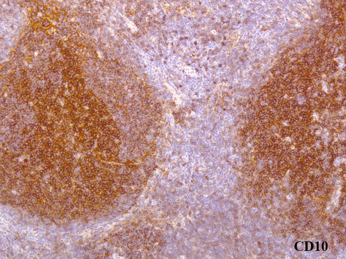1. 腫瘍性胚中心の外にも腫瘍細胞が存在する.--胚中心外にCD10陽性細胞が多数いれば腫瘍を考える.