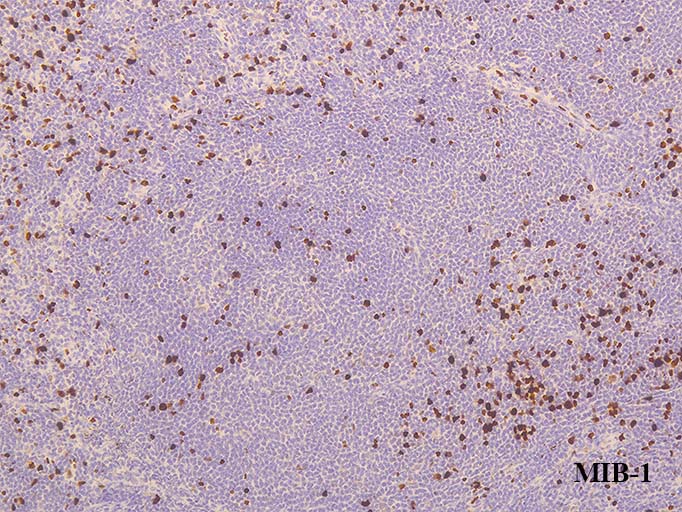 胚中心には核分裂像やapoptosis像が多く, 正常胚中心のMIB-1 indexは高い。(FLでは low MIB-1 indexとなる. 後述)