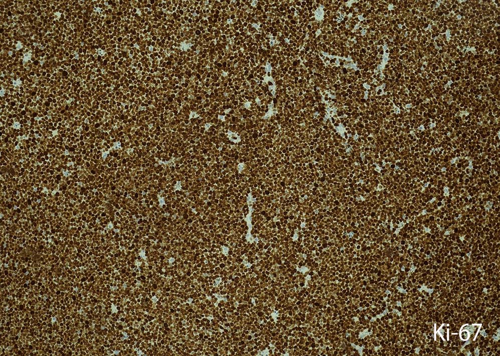 断片状組織片が採取され, 小型から中型の円形細胞がシート状密に増殖する. tindible body macrophagesが散在しstarry-sky様組織像を呈する組織片がある. CD3+, CD5+, CD20-, Ki-67 LI veru high(>95%),CD10-, BCL2(淡染だがほぼ100%膜陽性), BCL6陽性, MYC+(69%). T-cell neoplasmであるが, double expressorである. EBER-ISH陰性. CD4, CD8 double positive cellの増殖. CD25-, TIA1, granzymeBはいずれも陰性.