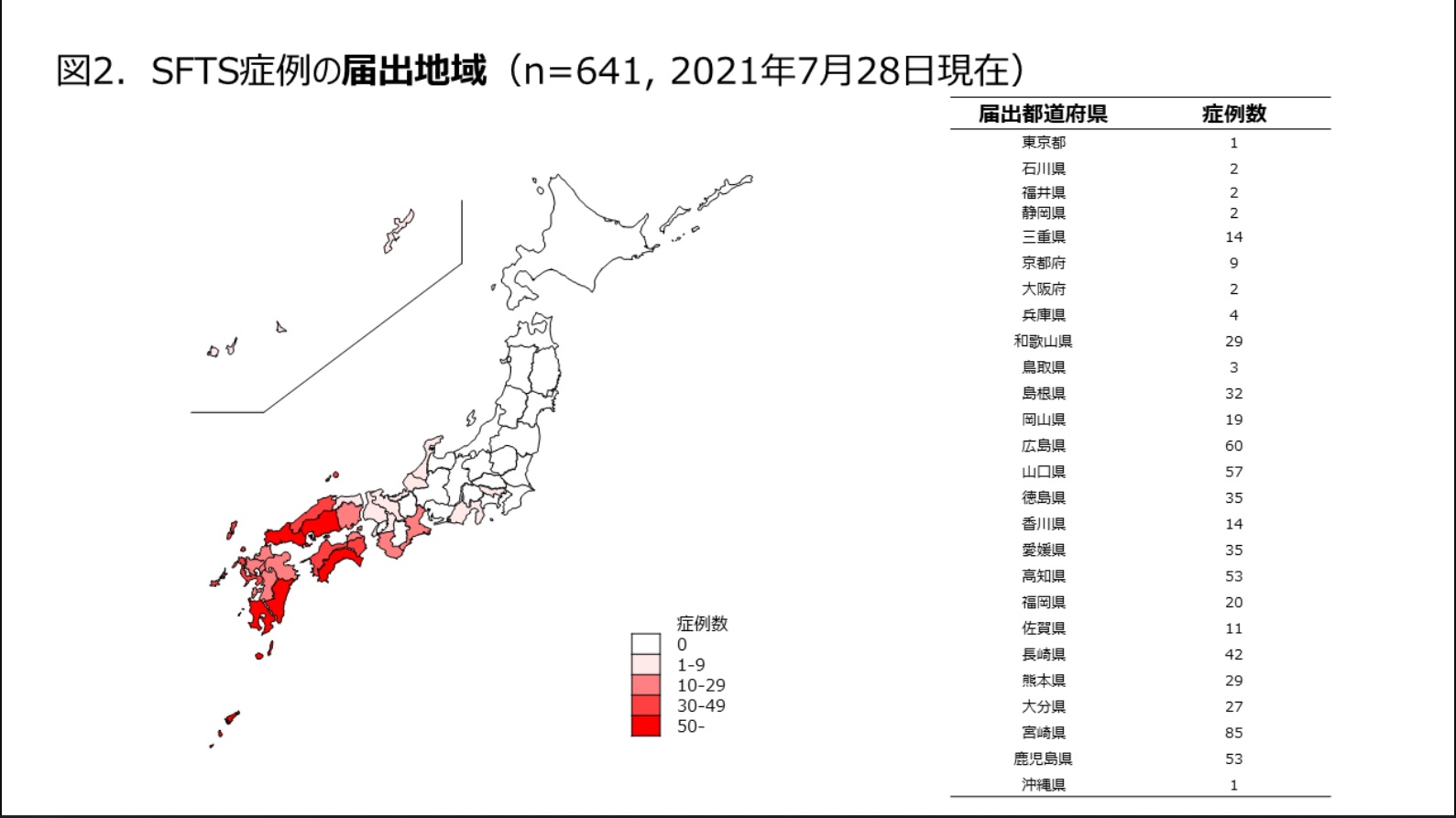 日本国内の第1例は, 2012年秋, 発熱や血小板減少を呈して死亡したが、ウイルス学的に初めてSFTSVに罹患していたことが後方視的に確認された。これ以後、過去の死亡症例を含めて約80以上の感染例が明らかになっている。*20