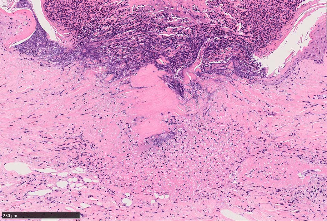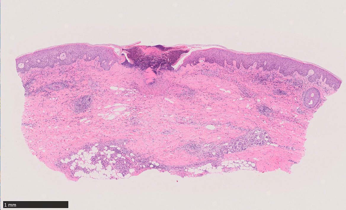 痂皮の下に硝子様凝固物があり, 周囲には壊死組織が形成されている. 近傍の細血管には凝固物による閉塞の所見があるように見える. 連続する細血管には, fibrinoid necrosisを呈する壊死性血管炎が認められる.