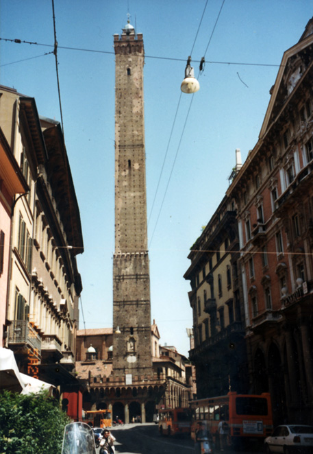 ボローニャの写真。「アシネッリの塔Torre degli Asinelli」12世紀に建てられた塔。中世ボローニャの皇帝派と教皇派貴族が争って「どちらがどれだけ高い塔を作るか」ということを競いました。当時のボローニャには200近い塔が存在しており、現在も23本残っています。