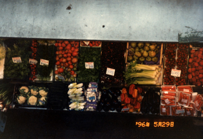 ホテルのまどからボローニャの八百屋さん店先を写しました。昔の写真で, 値段はリラです。