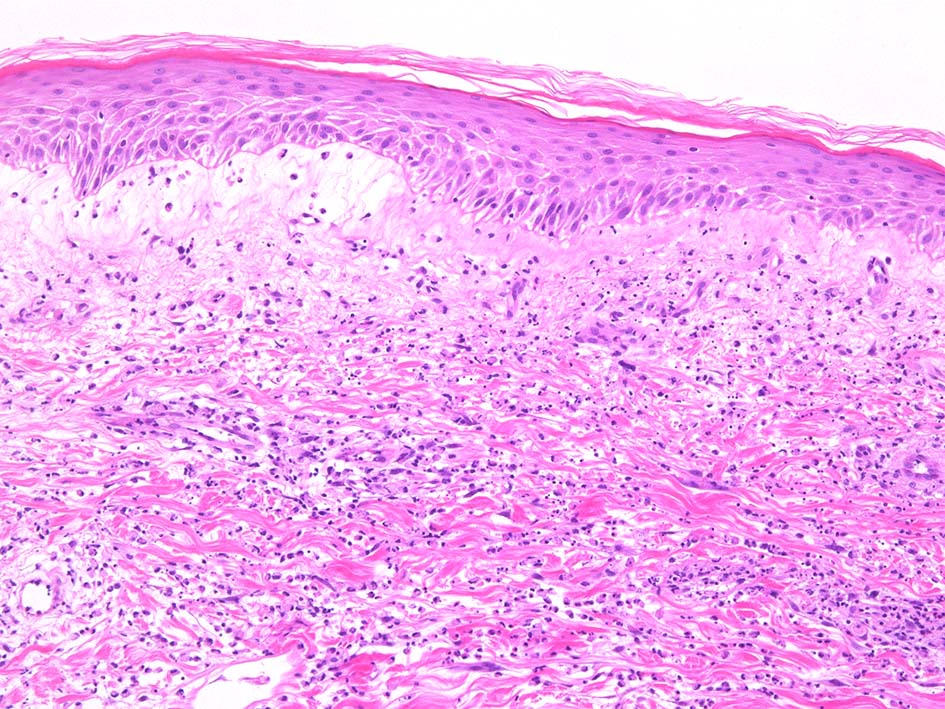 HE x40. 表皮下水疱あり. 真皮上層は浮腫状. 真皮から皮下組織にかけて, 多数の好中球が浸潤している. リンパ球, 好酸球が混在, 核破砕物を貪食するマクロファージが増加. 膠原線維にはところどころ変性が見られる.