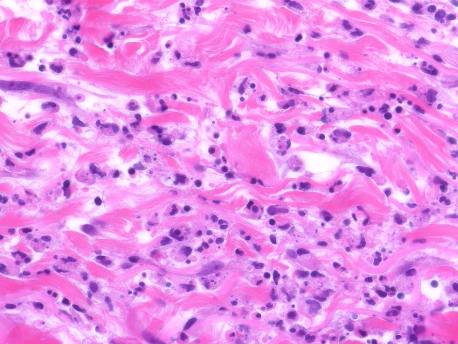 フィブリノイド壊死を呈する血管炎は認められない.皮下脂肪織炎病変には局所的なhemophagocytosisが認められる. 血管にはfibrinoid necrosisは見られない。