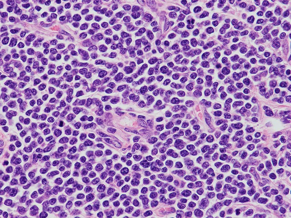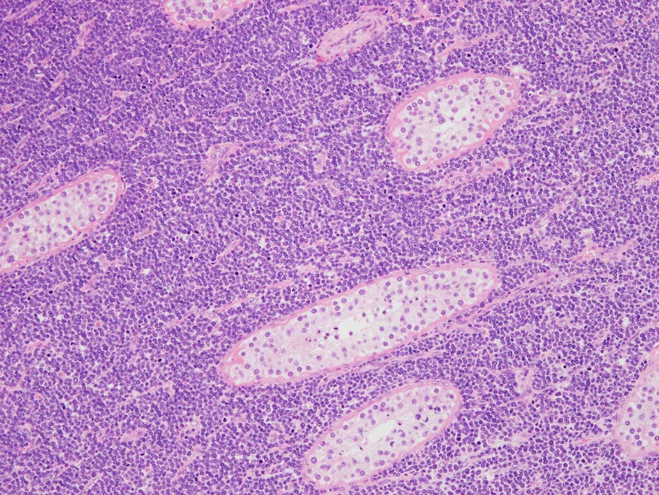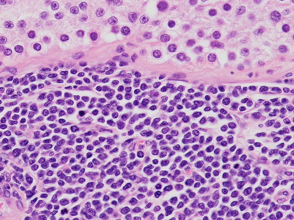 loupe像Aの領域: 精細管をスペアするように, 小型リンパ球優位, 一部中型のlymphoid cellsがシート状密に浸潤増殖する. tubulesのほとんどにはlymphoid cellsが浸潤していないが, LELに似たようなlympho-tubular lesionが少数認められた. x400高倍率では, 増殖細胞は, 粗く, 凝集したクロマチンをもつ類円形, non-cleavedな核をもつ細胞質の乏しいlymphoid cellsである. 核小体か凝集したクロマチンかわかりにくい.