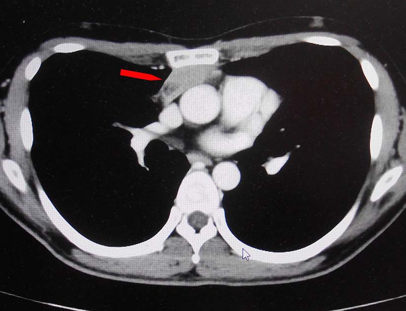 前縦隔や右心横隔膜角部に不定形, 不均一でべたっとした腫瘤状軟部濃度域を認める. 節外浸潤を伴ったリンパ節転移の可能性を考える.