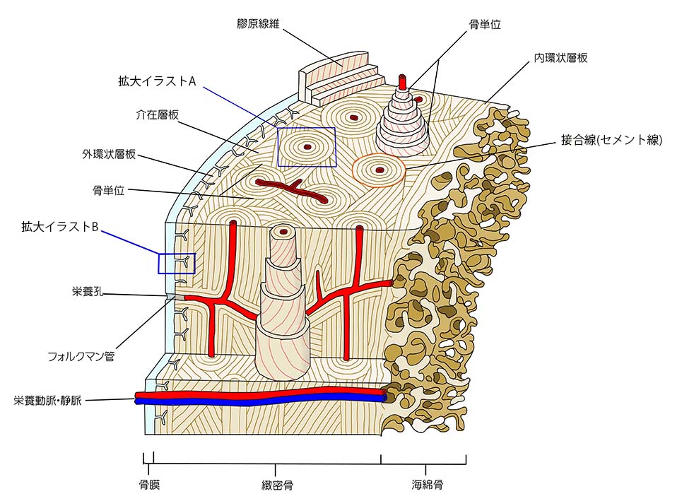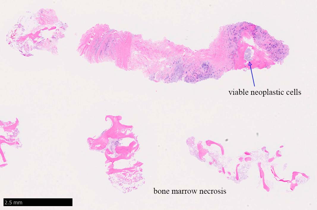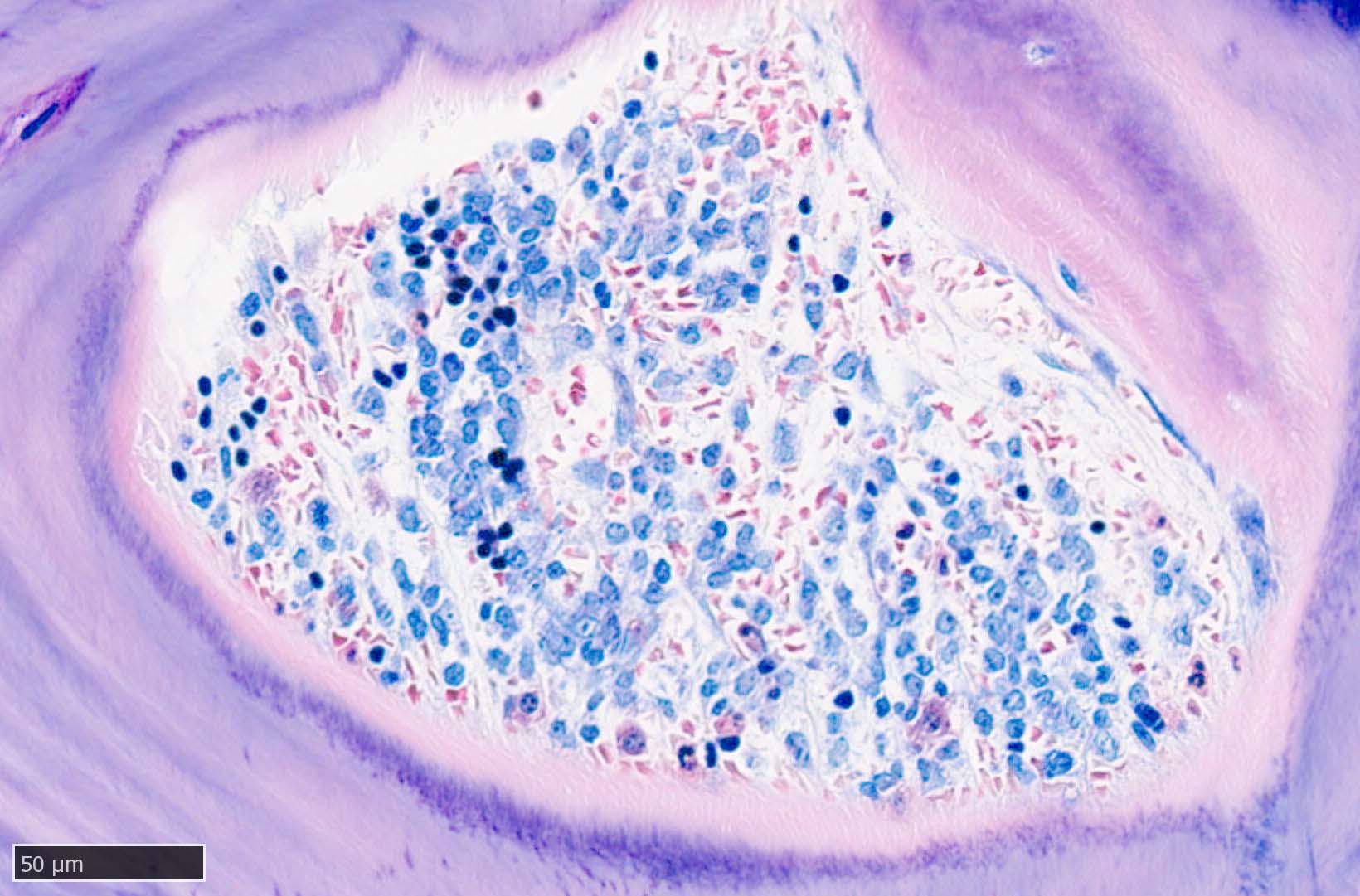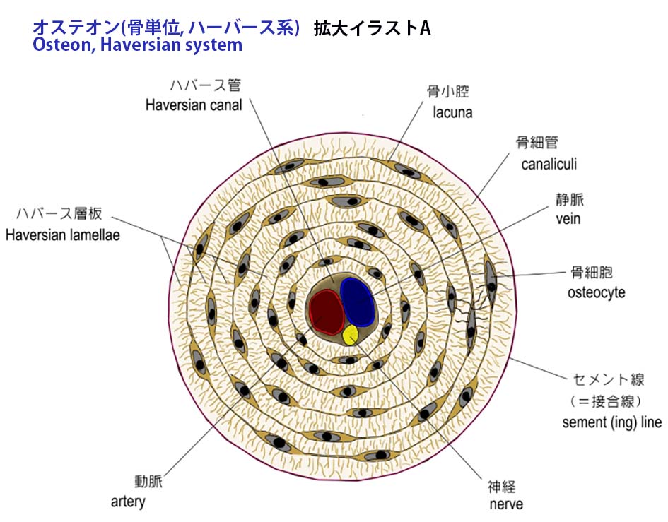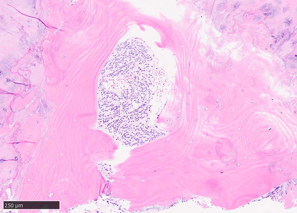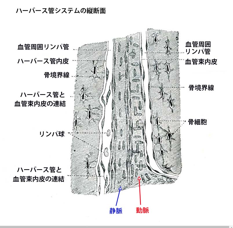 ハーバース管は緻密骨内の骨構造であり, 管内には動静脈, 脈管周囲リンパ管, 神経線維が入る. 解剖学的に海綿骨骨髄腔とは異なる空間構造と考えられる.--viableな腫瘍細胞の存在はリンパ管、血管内への腫瘍浸潤と考えられる.