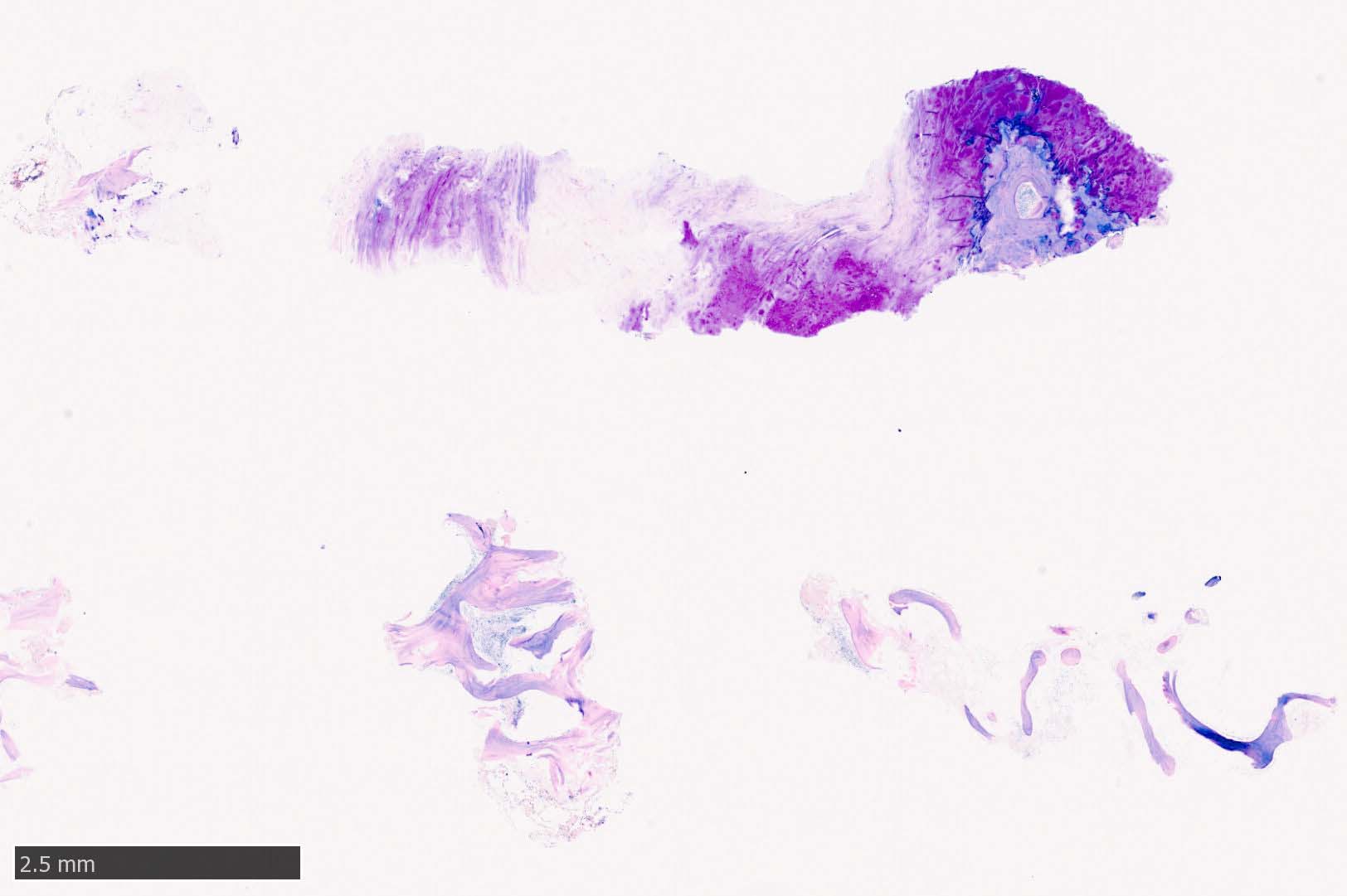 骨髄生検組織では骨梁間に壊死に陥った細胞の凝固壊死像が確認できる. 本例では脂肪細胞は消失せず形態が残っている.壊死のあとには, 髄腔に線維化をきたす. 上図には線維化を示し, 右端の図では壊死巣と線維化の境界が観察される.